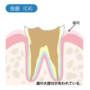 C4とは、歯の頭のほとんどが溶けて無くなってしまい、歯の根っこの部分まで虫歯になってしまった状態です。