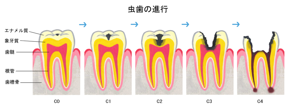 虫歯には、進行具合によってC0~C4と5つの段階があります。